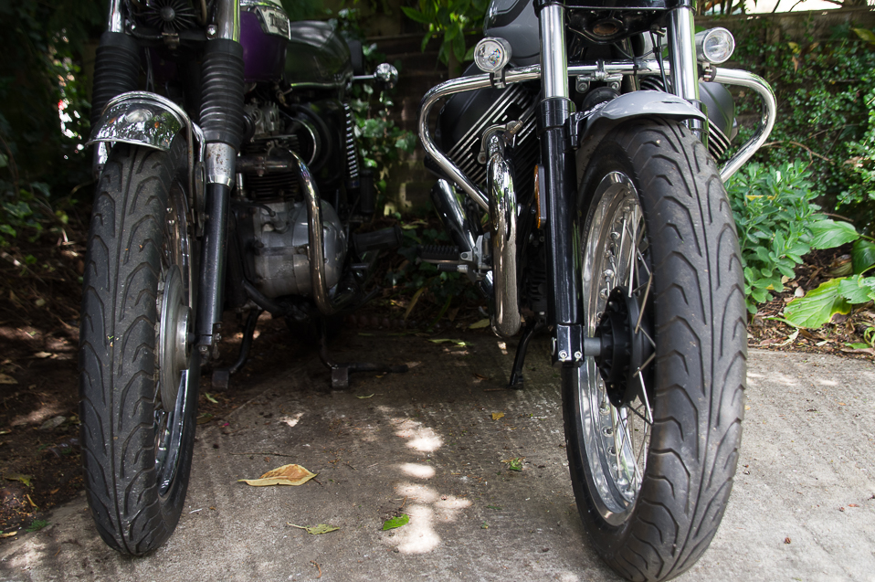 Triumph Daytona T100R (1974) and Moto Guzzi V7 (2022). Mirror mirror on the wall...