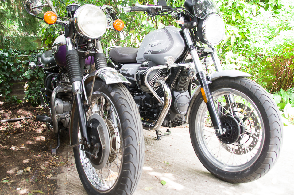 Triumph Daytona T100R (1974) and Moto Guzzi V7 (2022). Mirror mirror on the wall...