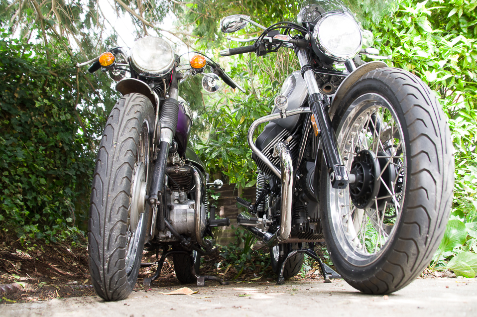 Triumph Daytona T100R (1974) and Moto Guzzi V7 (2022). Mirror mirror on the wall...