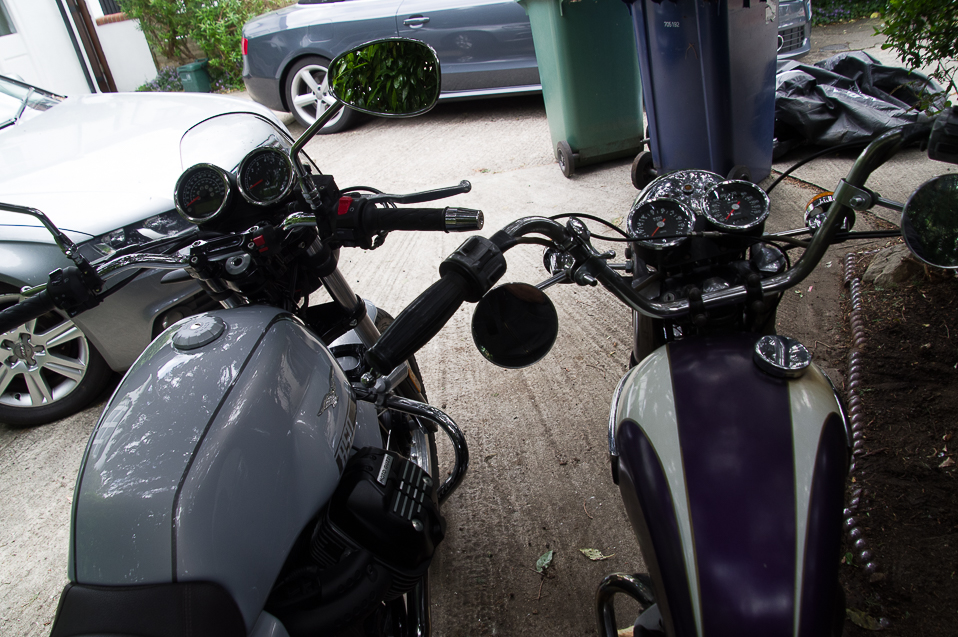 Triumph Daytona T100R (1974) and Moto Guzzi V7 (2022). Mirror mirror on the wall...