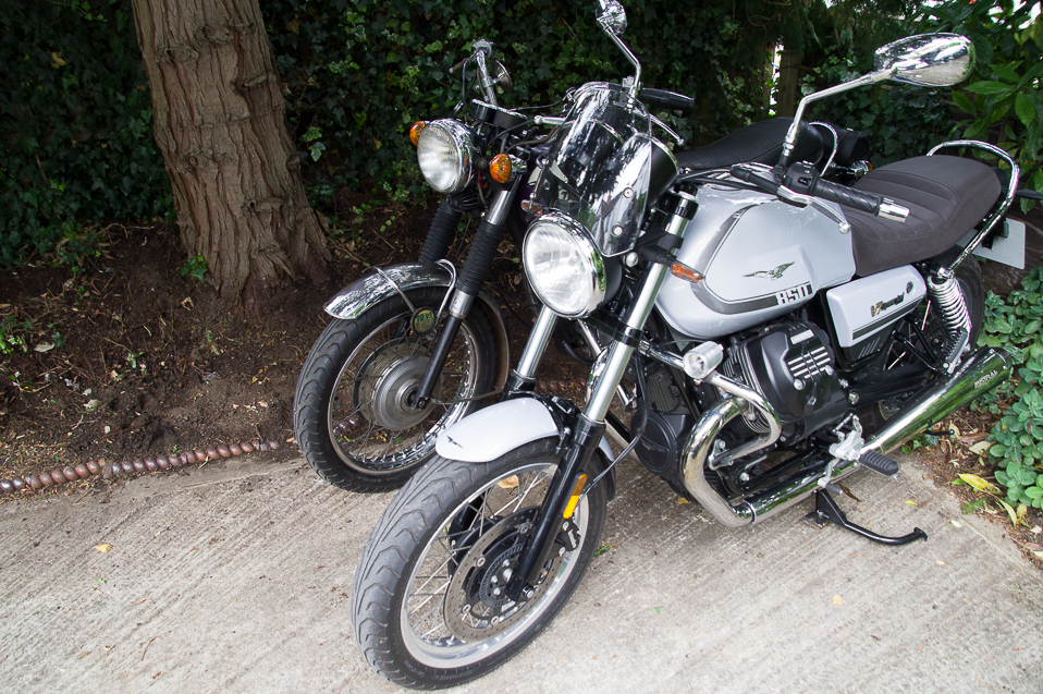 Triumph Daytona T100R (1974) and Moto Guzzi V7 (2022). Mirror mirror on the wall...
