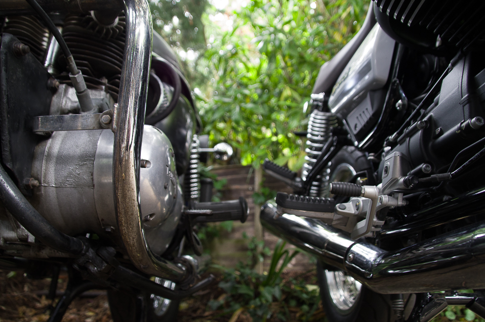 Triumph Daytona T100R (1974) and Moto Guzzi V7 (2022). Mirror mirror on the wall...