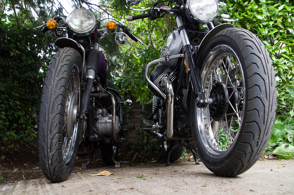 Triumph Daytona T100R (1974) and Moto Guzzi V7 (2022). Mirror mirror on the wall...
