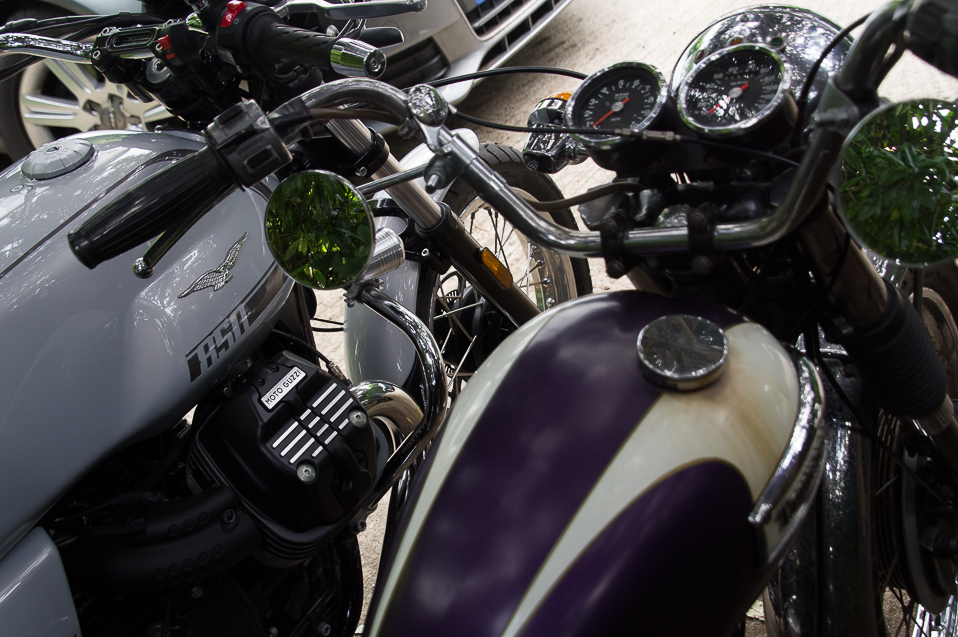 Triumph Daytona T100R (1974) and Moto Guzzi V7 (2022). Mirror mirror on the wall...